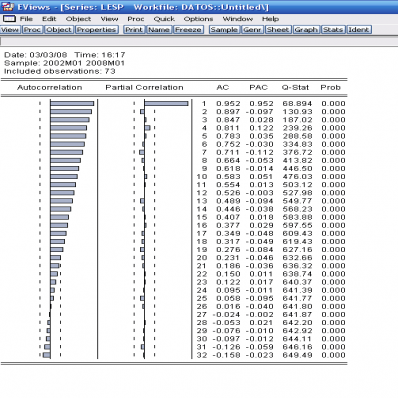 Antes de proceder al análisis econométrico es conveniente un estudio visual de las series para conocer sus propiedades. Se trata de una serie con crecimiento sistemático y su evolución suave parece sugerir la necesidad de tomar, al menos, una diferencia (regular o estacional) para conseguir estacionariedad.