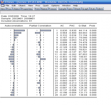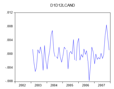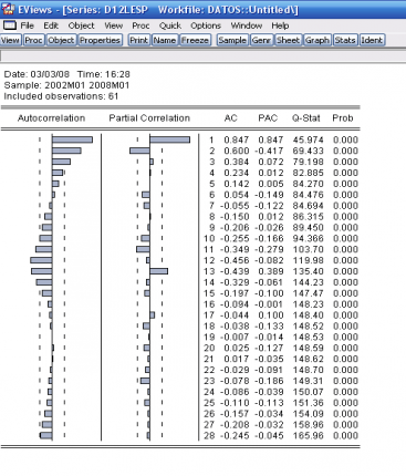 Tras una diferencia regular, los correlogramas de ambas series muestran correlaciones significativas en los retardos múltiplos de seis y de doce que persisten en el tiempo. Esto es una clara muestra de la necesidad de tomar, al menos, una diferencia anual para conseguir la estacionariedad. Es importante recordar que una raíz anual ya contiene una raíz regular más otras raíces que están relacionadas con el comportamiento cíclico de la serie en las diferentes frecuencias armónicas. En este caso, tomar sólo una diferencia regular no transformaría las series en estacionarias.