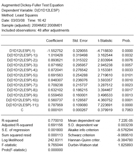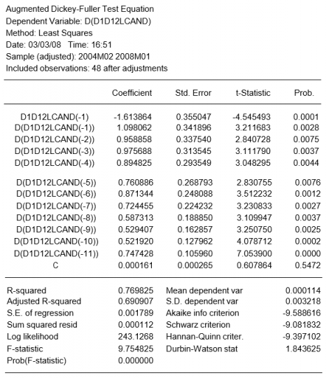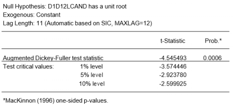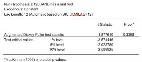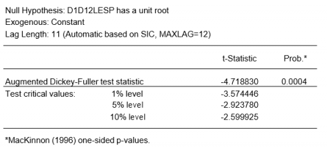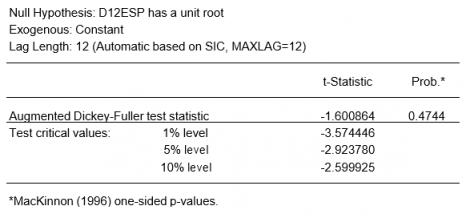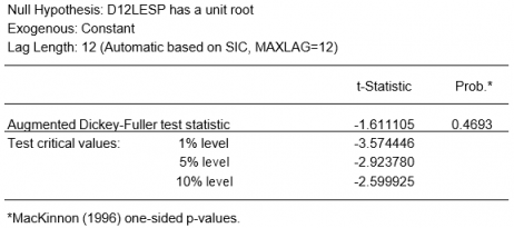 Para un análisis más formal, realizamos un test D-F de raíces unitarias cuyos resultados, mostrados a continuación, confirman la necesidad de tomar una diferencia adicional.