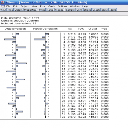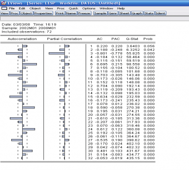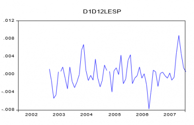 Los gráficos de ambas series parecen indicar oscilaciones locales de nivel con persistencia en diferentes valores medios durante el periodo de análisis. Esto parece indicar la existencia de diferentes cambios estructurales en la tasa de inflación que pueden aproximarse mediante un modelo que considera que el IPC necesita una diferencia regular y una anual para convertirse en estacionaria.