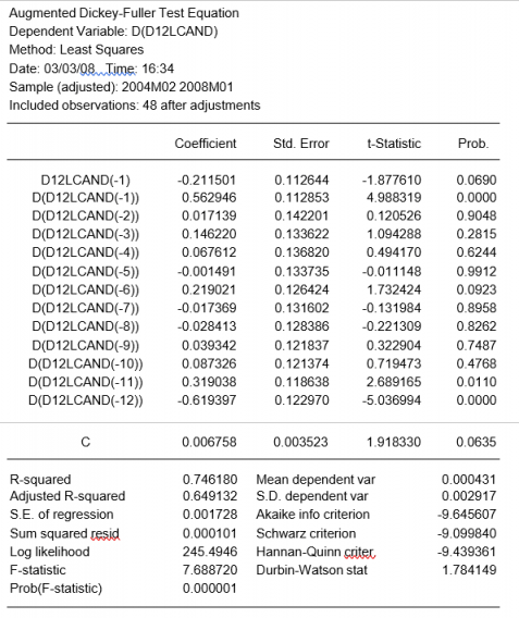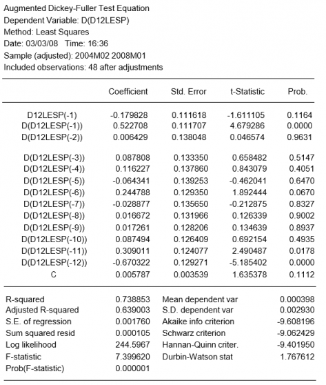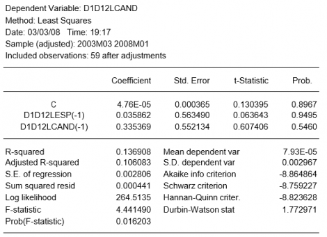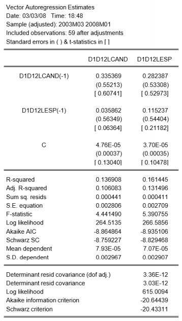 A pesar de que el test de Granger no indica una correlación importante entre las dos series, con el propósito de ilustración estimamos un modelo VAR. Para eso pulsamos 'quick/estimate VAR' y escribimos en las variables endógenas: d(lesp,1,12) y d(lcand,1,12) y seleccionamos el número de retardos que minimiza el criterio de información de Akaike que es 1.