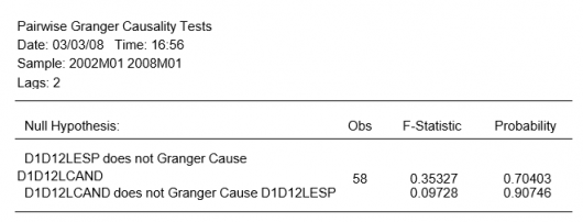 El test indica que no existe una retroalimentación fuerte entre estas dos series. Sin embargo, es importante enfatizar que el test de Granger no es un test de causalidad económica sino es sólo una forma de ver si los movimientos de una variable preceden a las otras.