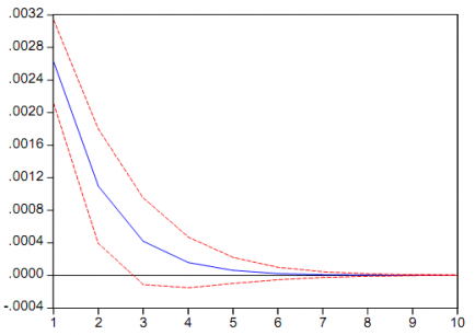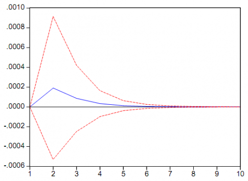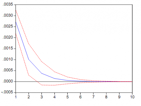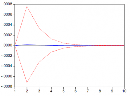 Los modelos VAR son modelos muy complejos (con muchos parámetros a estimar) y rara vez sirven para hacer predicciones. Pero si son útiles con propósito de simulación para ver como un shock inesperado en una de las variables afecta a las otras variables. Esto se puede hacer en EViews mediante la opción 'Impulse'. Para que podamos hacer este tipo de análisis es necesario ortogonalizar los shocks ya que, por ejemplo, los residuos en la ecuación de inflación en Andalucía pueden estar contemporáneamente correlacionados con los residuos de la ecuación de la inflación en España por lo que no sabríamos si los valores de los residuos en una de las ecuaciones están relacionadas con un shock estructural en Andalucía o España. EViews por defecto considera la opción de Cholesky para la ortogonalización (mirar en 'impulse response' dentro de 'impulse definition'). Esta opción consiste en imponer que la última variable está afectada contemporáneamente por movimientos en el resto de las variables, la penúltima está afectada contemporáneamente por todas las variables menos la última y así sucesivamente. El orden de las variables que utilizamos es: crecimiento de la inflación en Andalucía, crecimiento de la inflación en España.