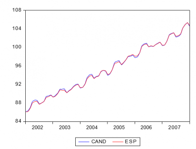 Series de IPC general en logaritmos para España y Comunidad de Andalucía